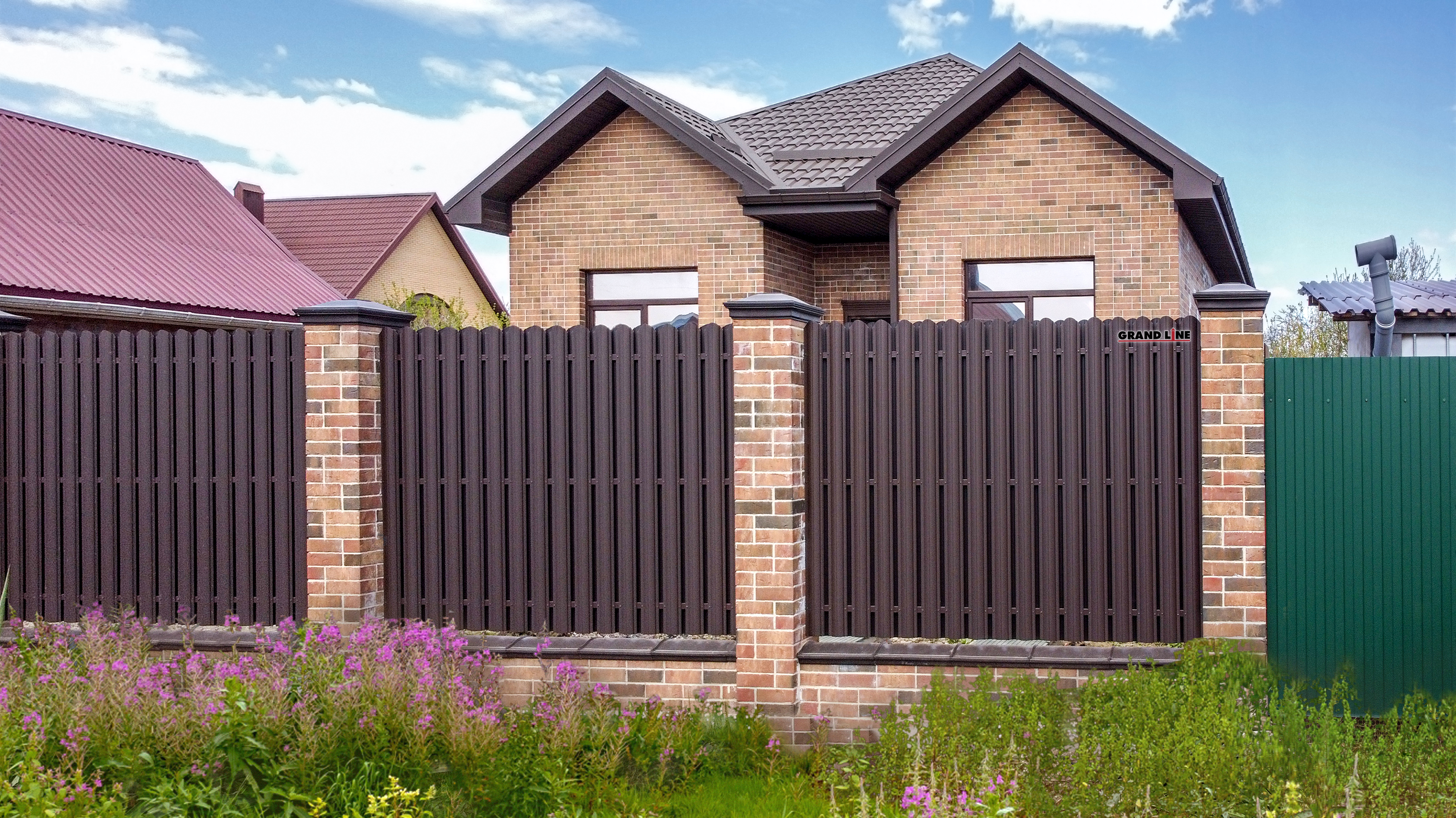 Темно-коричневый цвет добавит элегантности и стиля вашему дому, подчеркивая его индивидуальность. Металлочерепица Grand Line легкая в установке, прочная и долговечная, что делает ее отличным выбором для любого типа кровли.